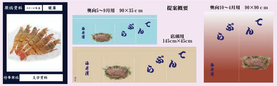 - ・暖簾や旗はシンボルマーク、故に品格が優先←予算に合わなければ色数・素材質を変更することも視野に入れる