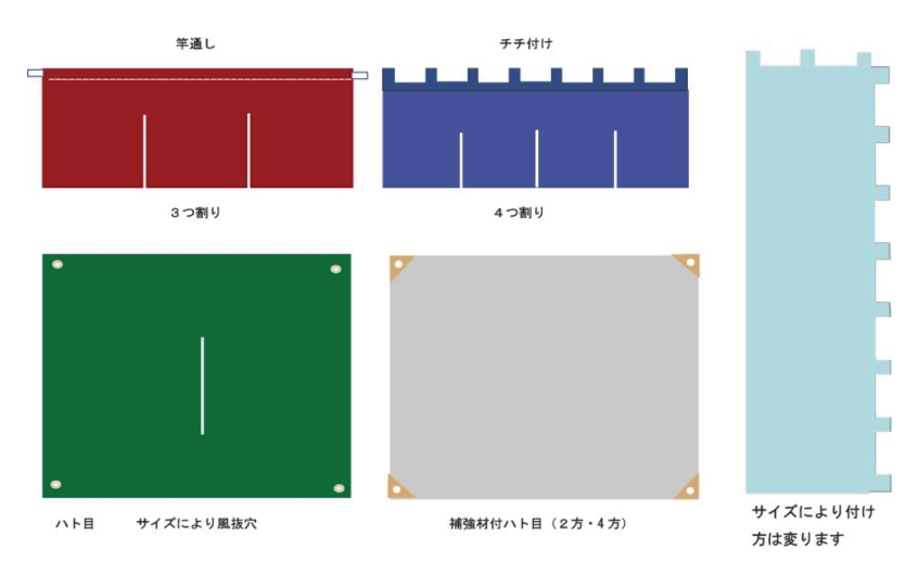 - ・設置する場所で大きさが変わりますので、竿通し(チチ※一定間隔で付ける輪状の布か一本の筒状が一般的)やハトメ、砂袋付けの有無、数を決定します。